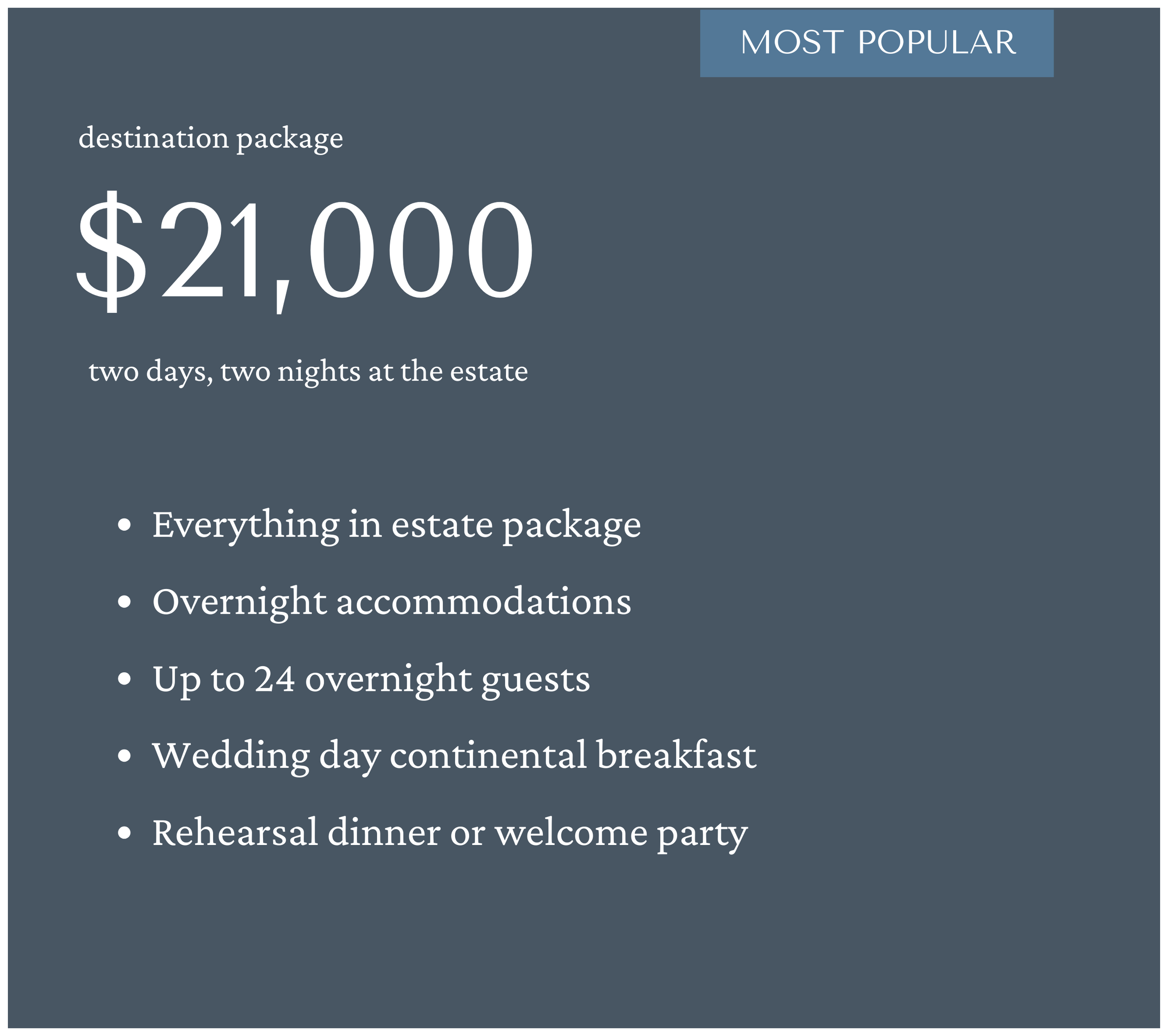 Pricing at The Felt Estate is straightforward. No taxes, no service fees, no mandatory gratuities added to the package price at the end. What you see is what you pay.