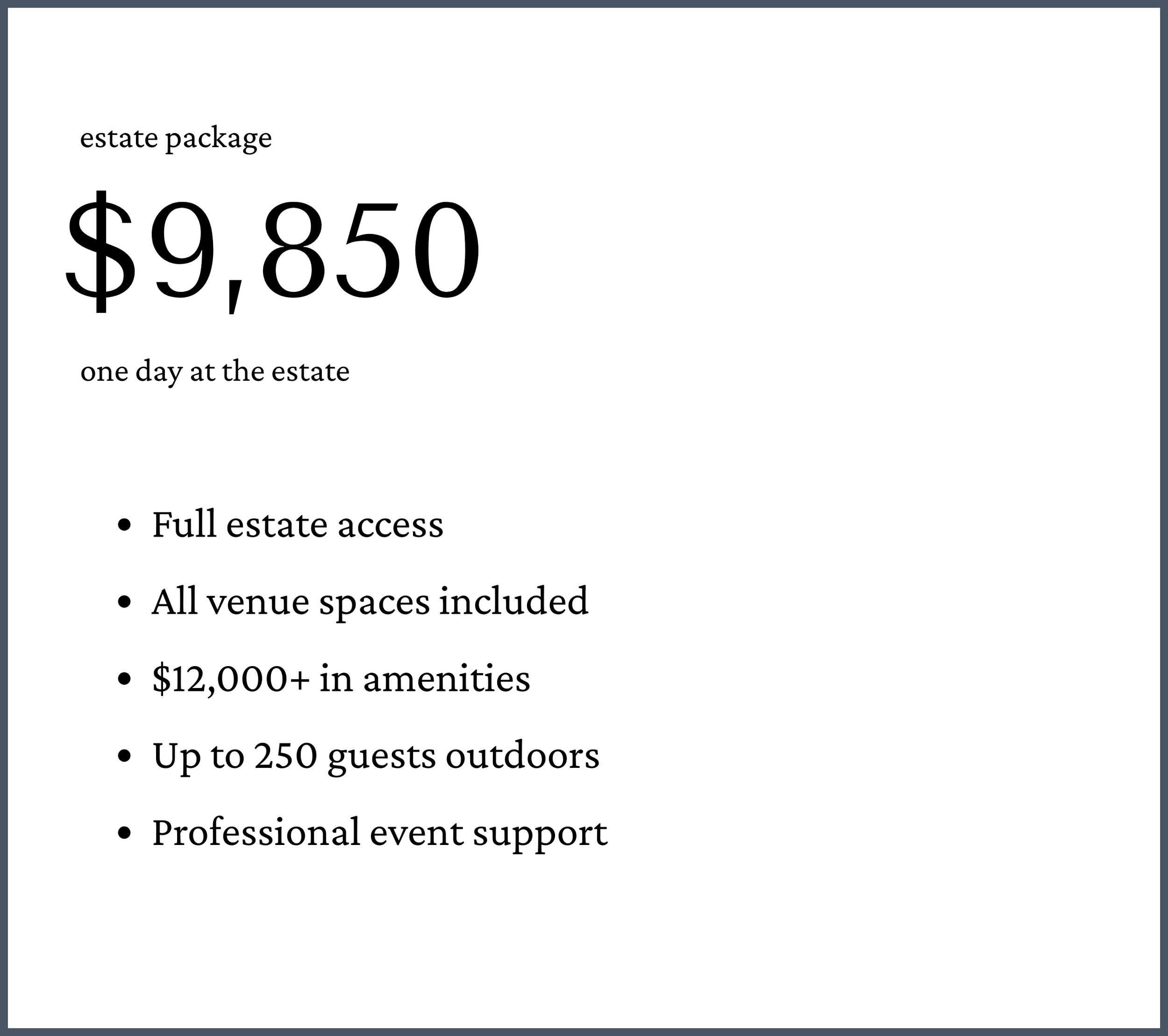 Every package comes with over $12,000 in wedding venue amenities already included. The setting is ready for your style, your vendors, your day.