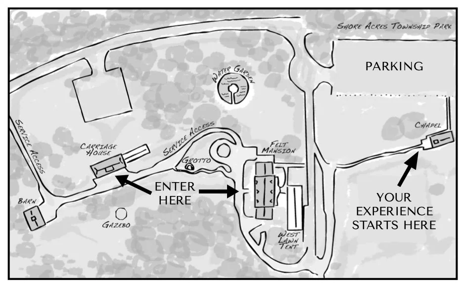 Free public parking is available in the gravel lot near the entrance of the estate. The evening begins in the chapel at the far west end of the parking lot. There is VERY limited access to taxi and rideshare transportation.