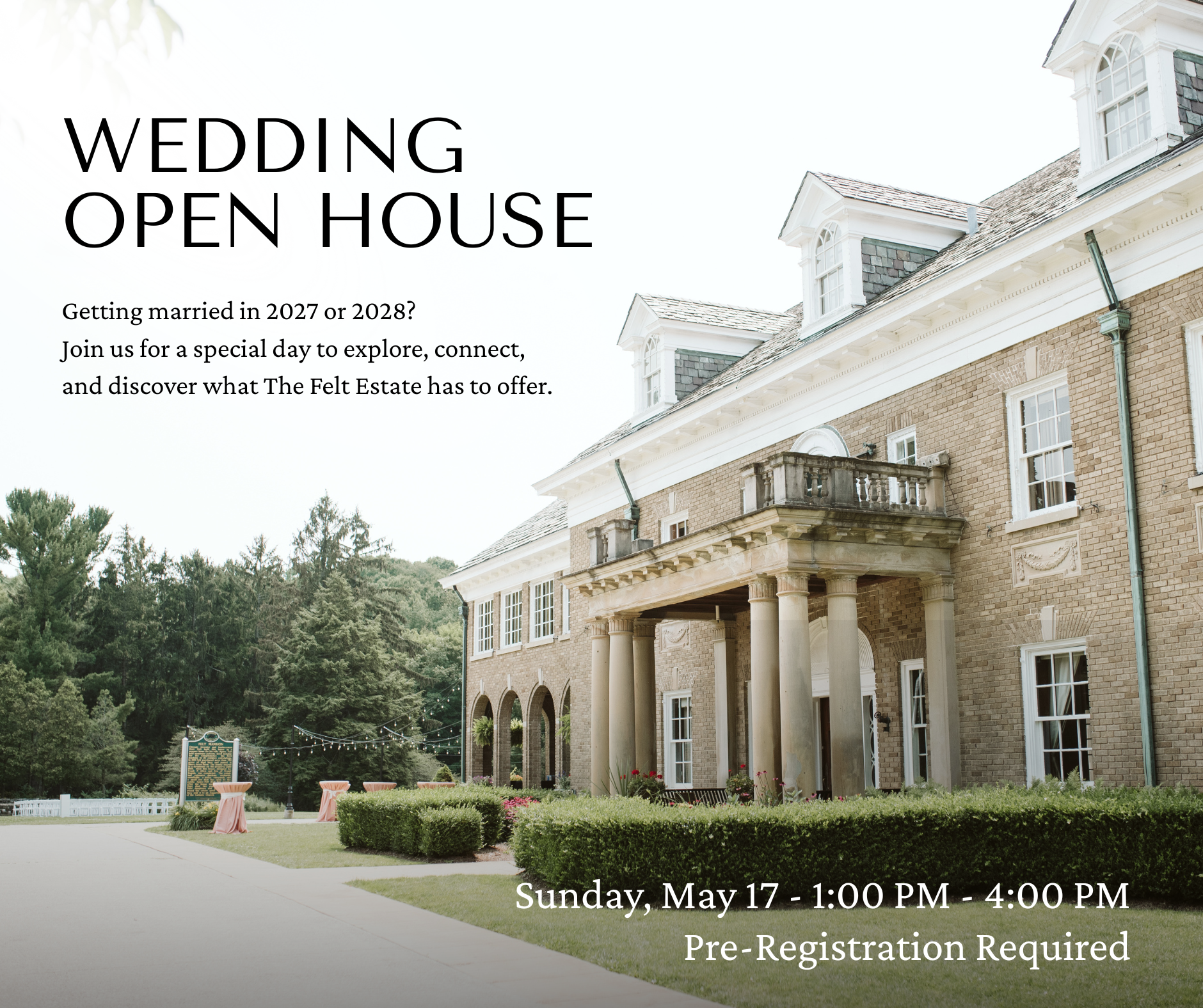 Explore The Felt Estate at your own pace during this relaxed, 90-minute self-guided tour designed for couples planning their wedding. Wander the grounds and interiors to imagine ceremony and reception layouts while meeting the estate team who can answer questions about the venue. Local wedding vendors will be present to discuss services and help you visualize details that will personalize your celebration.